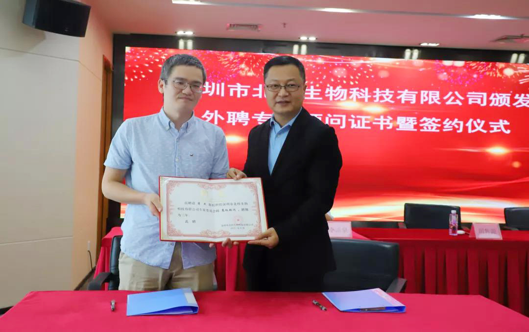 9月29日下午,為推動公司實(shí)現(xiàn)高質(zhì)量的發(fā)展,提升公司的核心競爭力,深圳市北科生物科技有限公司舉行了頒發(fā)外聘專家顧問證書暨合作項(xiàng)目簽約儀式。北科生物董事長胡雋源博士與蔣衛(wèi)教授簽訂《合作項(xiàng)目意向書》并頒發(fā)